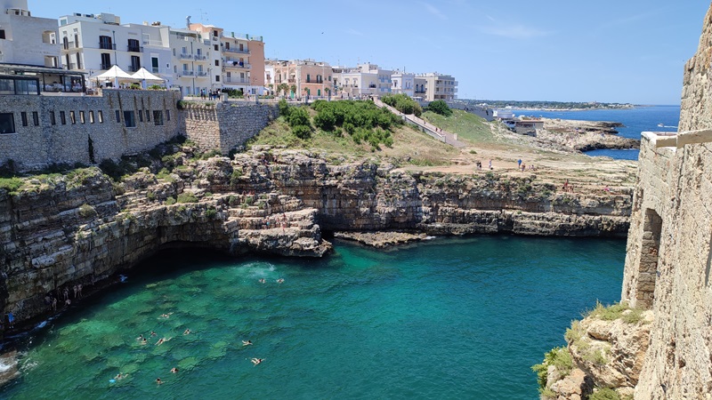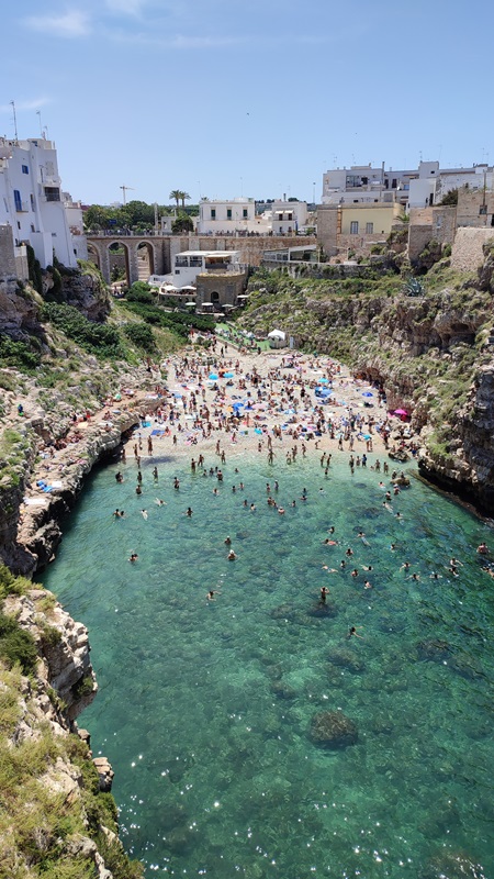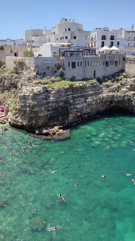 Polignano a Mare to malownicze miasteczko położone na wybrzeżu Apulii, nad Morzem Adriatyckim, słynące z zapierających dech w piersiach widoków, klifów i urokliwej starówki. To jedno z najbardziej rozpoznawalnych miejsc w regionie, przyciągające turystów swoją unikalną atmosferą i naturalnym pięknem. Polecamy wspaniałą plażę wciśnięta pomiędzy klify, z których skaczą ku uciesze tłumu plażowiczów odważni młodzieńcy, każdy taki wyczyn jest okraszany głośnymi brawami 🙂