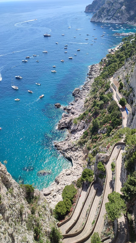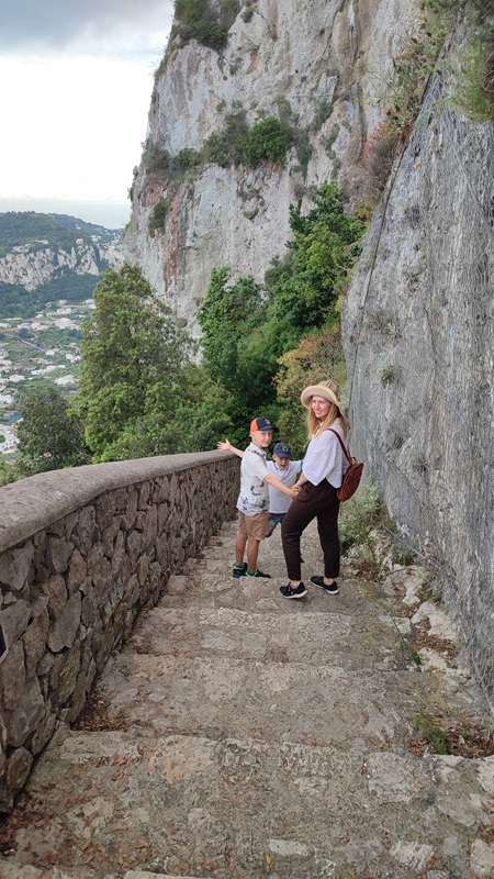 Wyspa podzielona jest pomiędzy modne i tłoczne Capri i spokojniejsze Anacapri. My oczywiście zwiedziliśmy obie miejscowości, zaczęliśmy od rejsu busem do Anacapri, potem szlakiem na Monte Solaro - najwyższy punkt Capri, z panoramicznym widokiem na całą wyspę i okoliczne morze. Wskazówka: nie ma możliwości zakupu biletu na kolejkę na szczycie ani on-line. Zatem podróż powrotna do Capri dla nas odbyła się pieszo, ale za to mogliśmy skorzystać ze słynnych starożytnych schodów Fenickich, to ponad 920 kamiennych stopni, które łączą miasto Capri z Anacapri.
